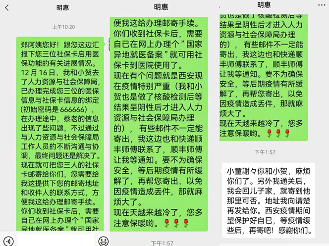 在老人單位的配合下,雙方一同前往市醫(yī)保經辦中心修改職工醫(yī)?;拘畔?,并獲取綁定信息所需材料。過程中又發(fā)現老人未及時反饋證件信息更新的情況,此外還遇到個人養(yǎng)老認證綁定信息的確定、市人社系統(tǒng)內無法查詢其中1位老人信息、疫情形式嚴峻等問題。工作人員克服重重困難,最終將鄭明慧老人及其他2位老人的社??ㄅc醫(yī)保信息成功綁定。至此,耗時近10個月,平臺事業(yè)部成功協(xié)助3位居住在香港的退休職工領取到社???,并將職工醫(yī)保信息綁定到其社???。